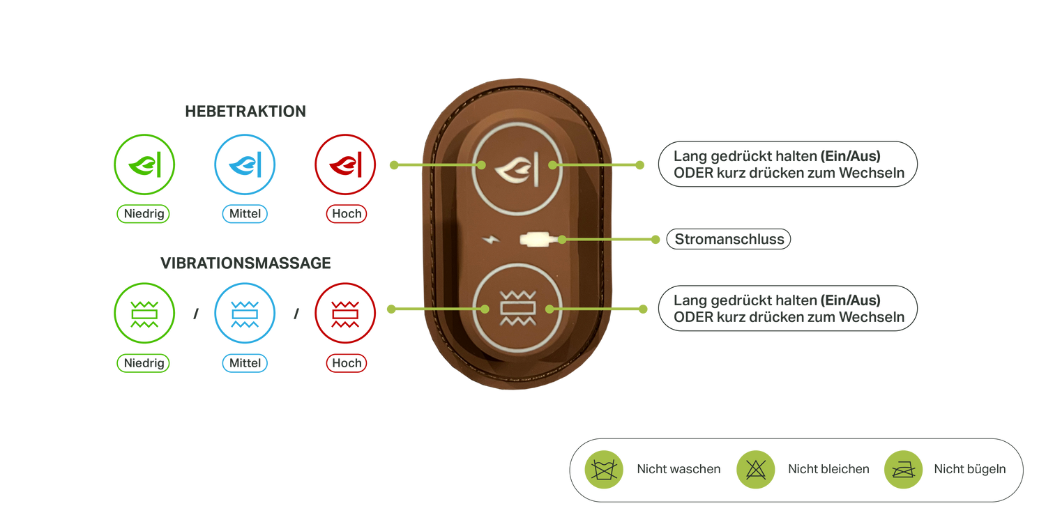 Das Taillentherapiekissen verfügt über eine Vibrationsmassagefunktion, die Rückenschmerzen im Lendenbereich durch Muskelverspannungen, Steifheit oder Verhärtungen lindert. Mit drei einstellbaren Intensitätsstufen können Nutzer zwischen einer sanften Massage und einer tiefen Muskelentspannung wählen.